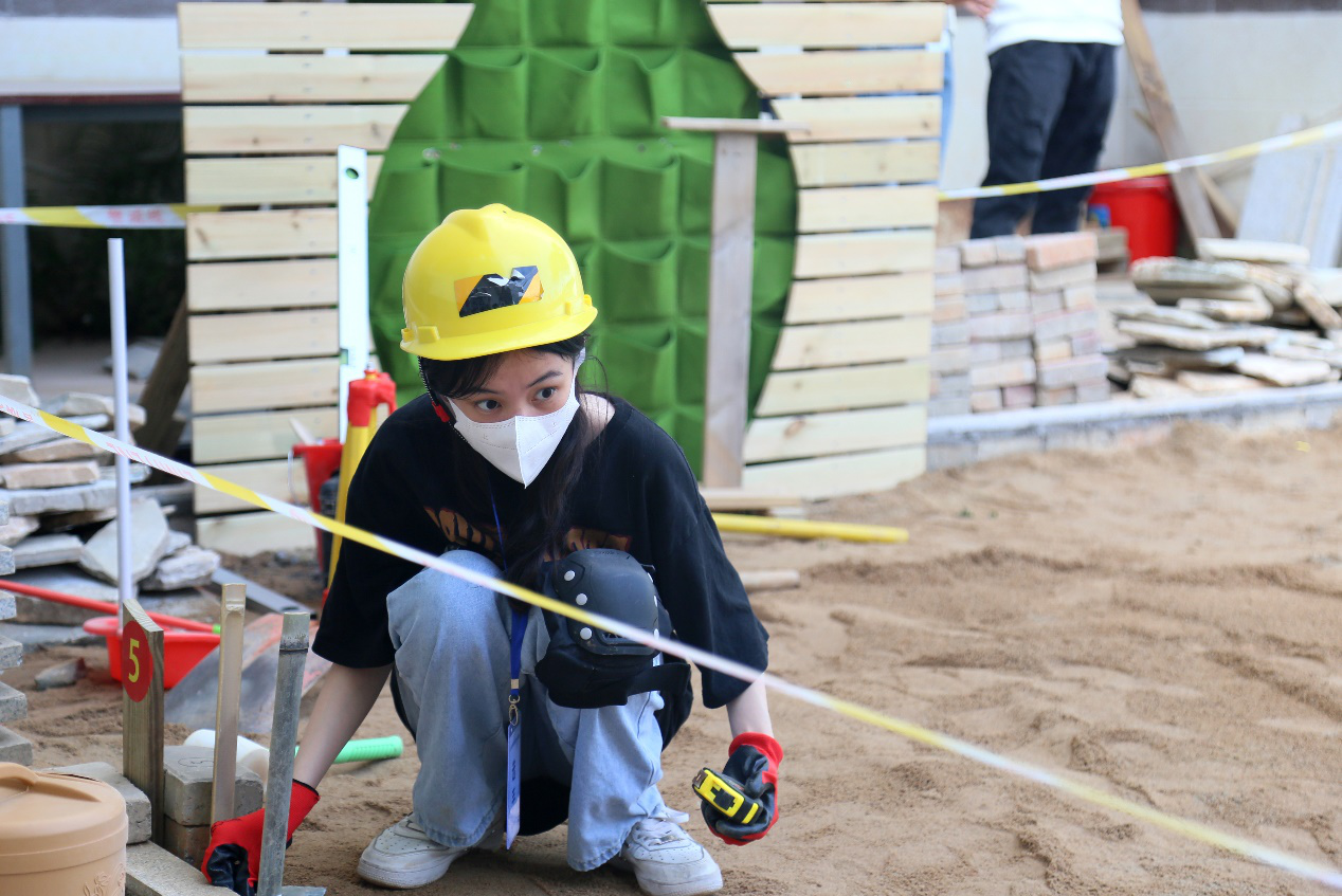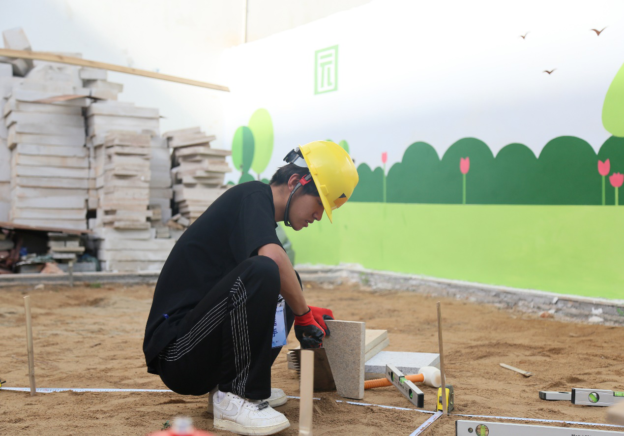 园艺赛场上,参赛队伍凝神专注、分工协作,按照赛事的施工方案,熟练地运用各种工具和材料,对指定造景材料进行制作、安装、布置和维护,并依据团队构想,对石材、木板等进行切割,精心打造着园林景观造型。该赛项囊括了木作、砌筑、铺装、水景营造、植物造景这五大核心模块,通过比赛进一步提升学生实践动手能力,以赛促学、以赛促教、以赛促技、以赛促训,在实践育人过程中培育和弘扬“工匠精神”。