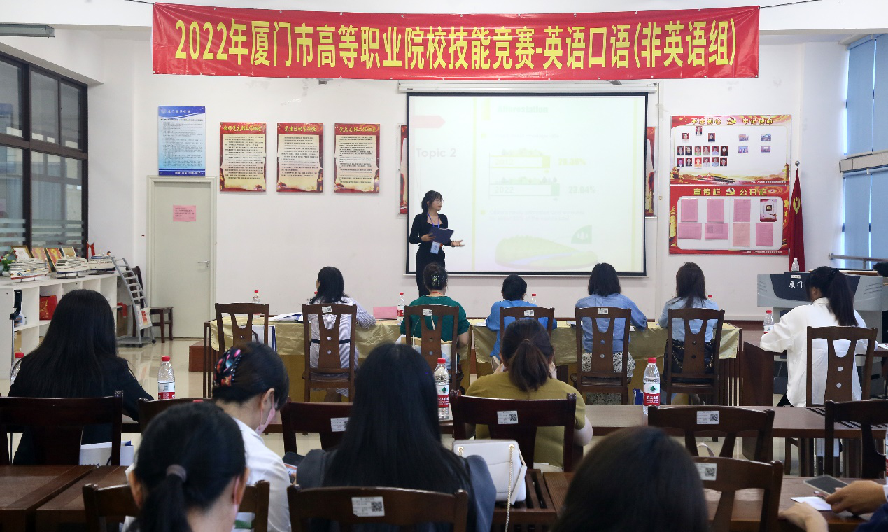 在英语口语赛场,27名选手仪态得体、思路清晰、语言丰富,有条不紊地阐述观点。各参赛选手在“职场描述”“情景交流”两个比赛环节中不断拓展思路,娓娓而谈,用灵活的交流技巧展现自己在校的所学所用,尽情发扬高职学子的青春风采和运用英语进行职场交际的综合能力。