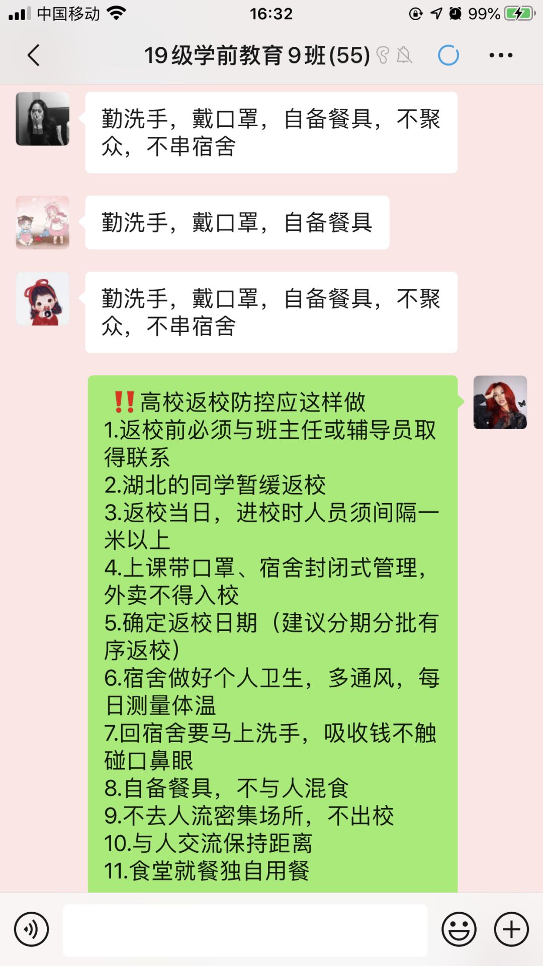 四、团支书转发《高等学校新型冠状病毒肺炎防控指南》,让同学们学习如何做好返校防控措施?全班同学就返校后如何做好防控措施的话题展开热烈的讨论,总结出几点措施:1.返校前必须和辅导员取得联系。2.返校时进校人员必须隔离一米以上。3.上课戴口罩,宿舍封闭式管理,外卖不得入校。4.宿舍要做好个人卫生,多通风,每天要记得测量温度,勤洗手。5.要自备餐具,不与他人混食。6.不去人流密集的地方,与人交流保持距离。7.在食堂要独自用餐。